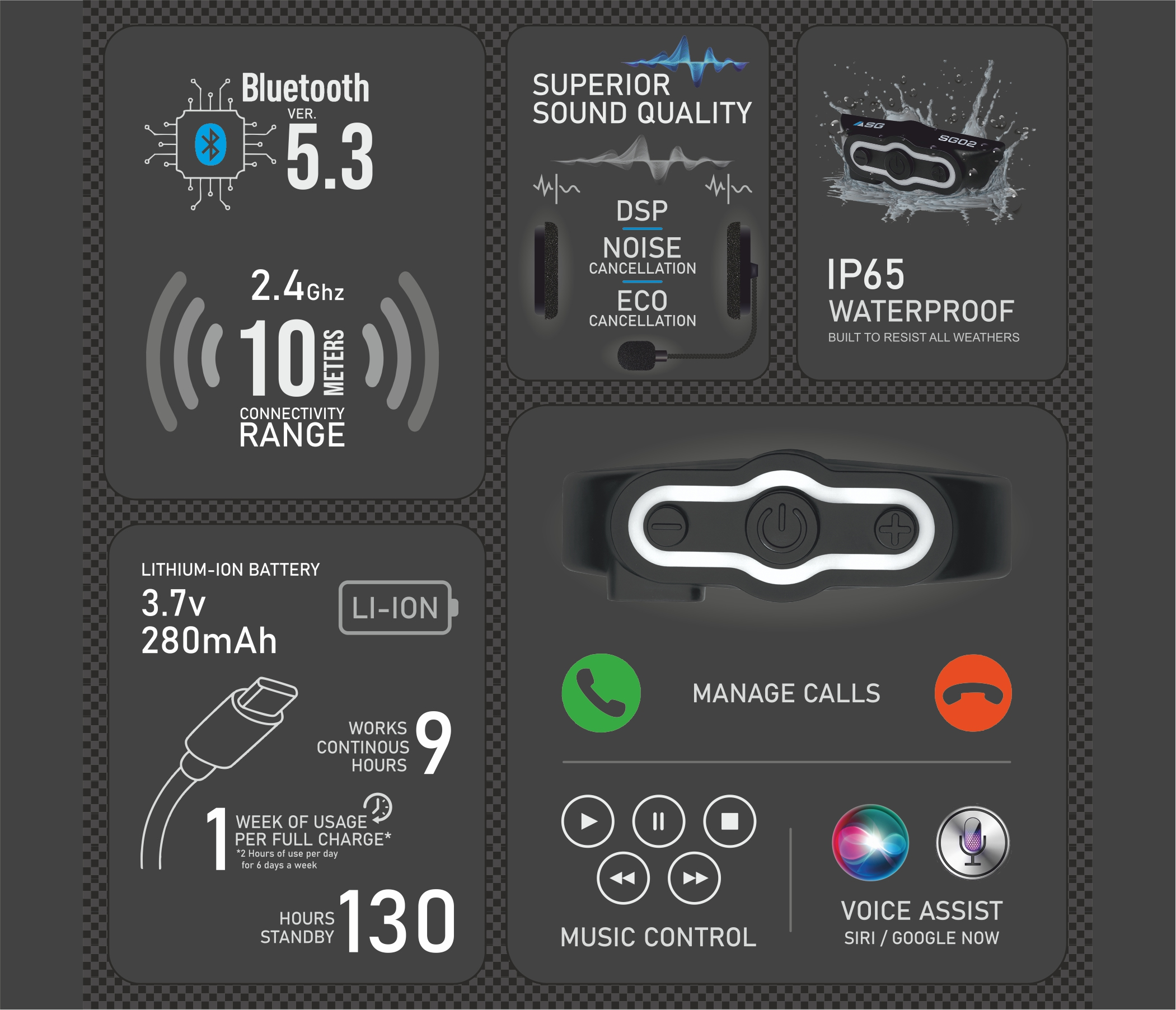 - SG-02 is a Bluetooth Helmet Headset specially designed for motorcycle riders who do not wish to miss their important calls. It is compatible with almost all Bluetooth enabled cellphones and fits any sort of motorcycle helmet. This headset allows you to answer calls or hangup/reject phone calls, redial last called number and manage your music i.e Play/Pause Next/Previous Track & of course at anytime Increase/Decrease the volume. DSP echo cancellation and noise suppression technology ensures high quality voice calls while riding. Don´t hesitate to buy now!